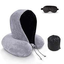 LAMART Travel Neck Pillow for Airplane Sleeping, Memory Foam Neck Hooded Pillow for Sleep Well, Travel Neck Pillow with Hood and Eye Mask to, Lightweight Neck Pillow (Grey/Black)